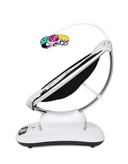 It moves like you do™ The 4moms® mamaRoo® infant seat bounces up and down and sways from side to side, just like parents do when comforting their baby. Select from five unique motions, Rock-A-Bye, Kangaroo, Tree Swing, Car Ride, Ocean, and five different speeds. Choose from four built-in sounds or connect it to any MP3 player. The seat reclines to multiple positions to allow baby to lie back and relax or sit up and play. The mamaRoo is also Bluetooth enabled so you can control motion and sound with your smart device via the 4moms App (downloadable from the Mac App Store or Google Play) – Connect your MP3 compatible device to play your own music or select from the 4moms 5 built in nature sounds to soothe your child and volume from your compatible smart device without disturbing baby! The overhead toy mobile now includes interactive, reversible toy balls. Keep baby’s attention with the sound of the crinkle ball, rattle or reflective mirror ball.