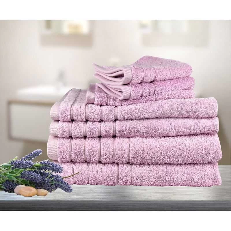 This popular pink bath towel combo set includes 2 bath towels, 2 hand towels, 2 face washers and 1 bath glove in the Egyptian cotton Elegance towel range with a weight of 620 GSM and long loop terry of 12 mm which are extremely dry, soft and absorbent. A no synthetic band design gives the towels the maximum cotton terry ratio with the tiny cotton ribbons.