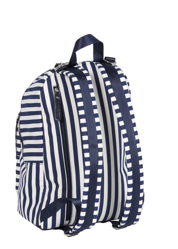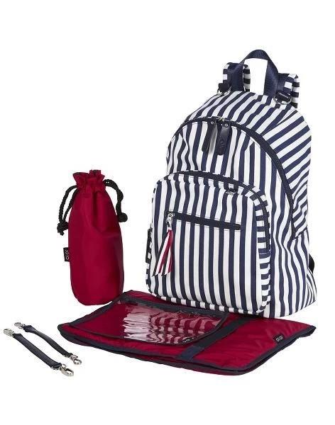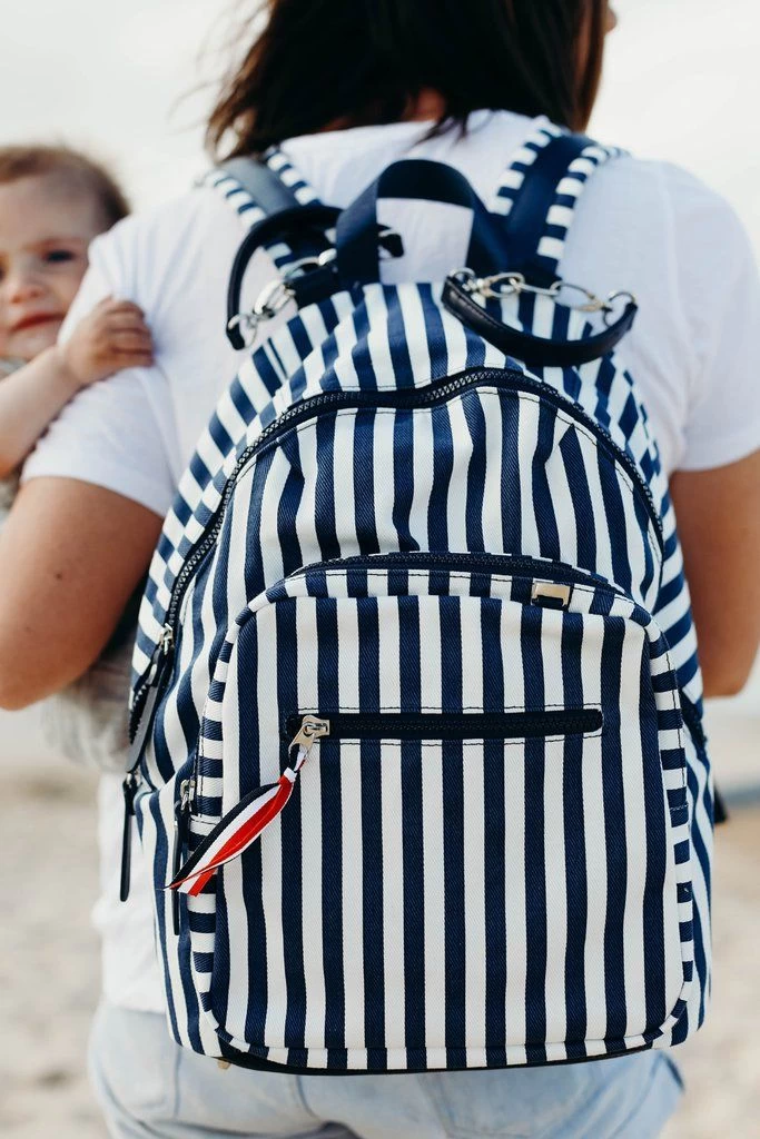 Fresh Stripe Canvas Backpack. Great for city or beach.. includes Change Mat, Bottleholder and generous zip top purse for wet ones! Water resistant finish canvas. Comfy padded backpack shoulder straps. Stroller straps. Exterior insulated front pocket for drinks and zip pocket for personal items – keys & phone. Large back zip opening for quick access to inside your backpack.