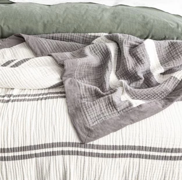Bring a global style to your bedroom with the Brighton blanket. Woven using six layers of soft cotton muslin. Featuring yarn dye horizontal stripes pattern, clean edge detail and a wash finish for the everyday look. Muslin is naturally temperature regulating, ultra-breathable, hypoallergenic, all-natural & supremely cuddly. Available in four seasonal shades, this blanket will become an all-season favourite.