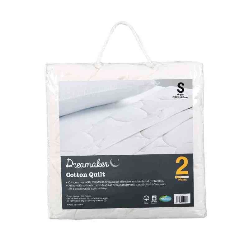 This Summer Blanket Duvet Quilt is filled with soft and natural combed cotton. The fibre processing ensures greater loft and breathability for added comfort. Luxurious cotton cover helps to reduce moisture retention and treated for effective anti-bacterial protection. This summer quilt is available in single, double, queen, king, and king single sizes.