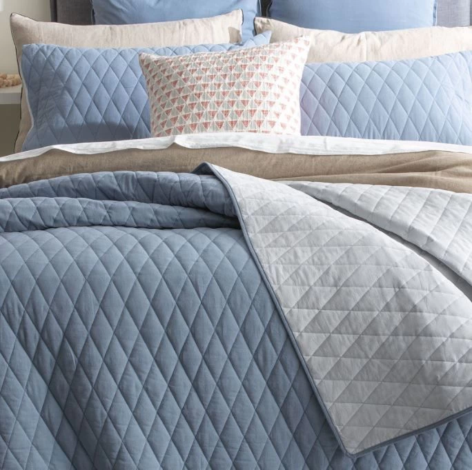 Diamante Coverlet evokes feelings of a summer holiday with it’s gorgeous sea inspired colour palette. Stone washed cotton base fabric and diamond quilting pattern. This effortless reversible design is perfect for layering as extra warmth in winter and as a light layer in Summer.