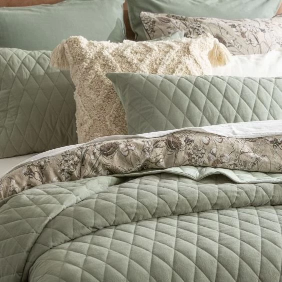 Diamante Coverlet evokes feelings of a summer holiday with it’s gorgeous sea inspired colour palette. Stone washed cotton base fabric and diamond quilting pattern. This effortless reversible design is perfect for layering as extra warmth in winter and as a light layer in Summer.