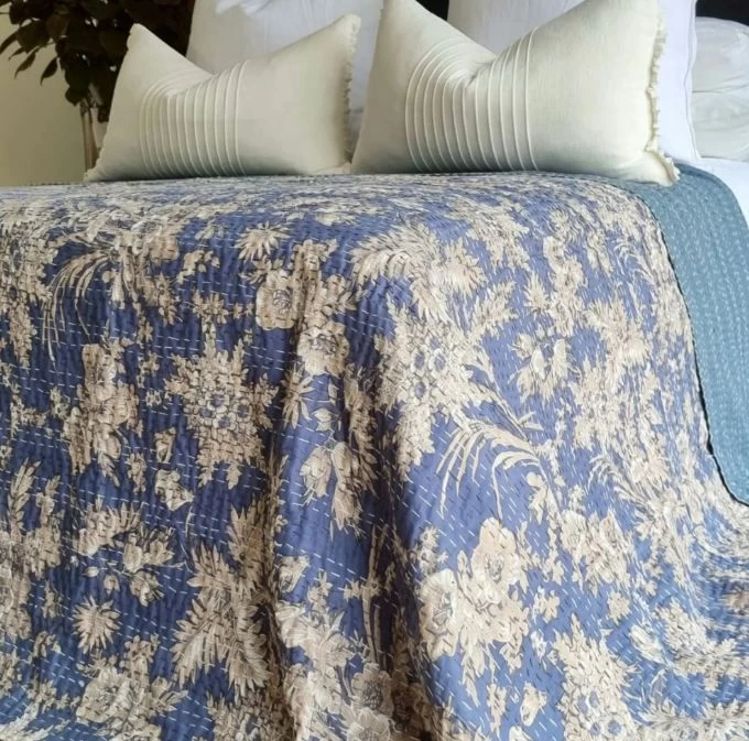 Our kantha bedspreads add personality and vibrancy to any room. The quilt is characterised by its textured finish and intricate kantha work. Delicately hand made with lightweight natural breathable cotton fabric, this floral bedspread will keep you refreshed and cool during warmer temperatures and add colour and layer to your bed during the cooler months. Three layers of superior durable cotton fabric are stitched together by hand to create this amazing work of art.