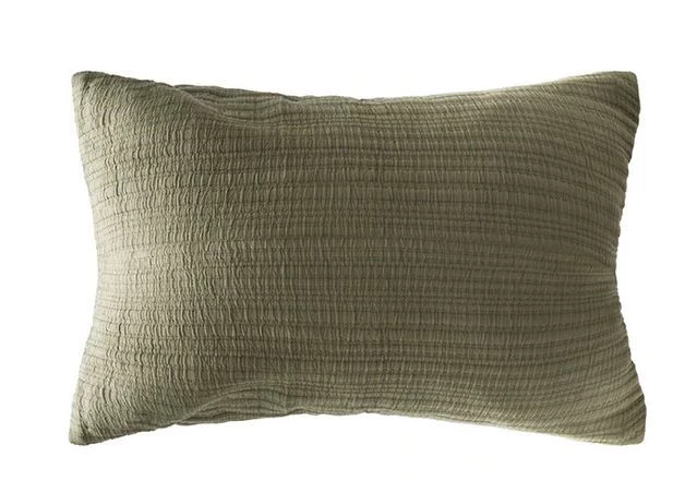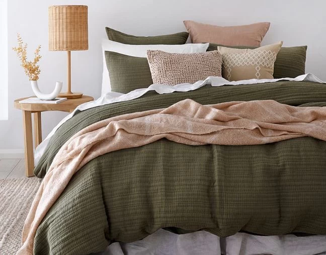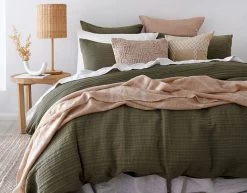 Our Lores design is the perfect quilt cover for every season. The jacquard fabric features rows of horizontal cotton stitching which gives a beautiful texture and quilted quality to the surface of the design. Some may even choose to remove the quilt fill and use Lores as a coverlet throughout the warmer months too. The reverse side of this quilt cover is a soft cotton percale fabric in a plain-coloured olive green tone that matches the front. The elegant olive green colour is the perfect choice for layering with a range of cushions and throws for trans-seasonal styling.