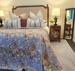 Sprays of flowers from the English rose garden brought to your bedroom in a soft luxurious quilt. Fine layer of printed cotton hold between them hand-fluffed carded cotton, that provides cosy warmth in the colder months and the not so heavy feel in summer.