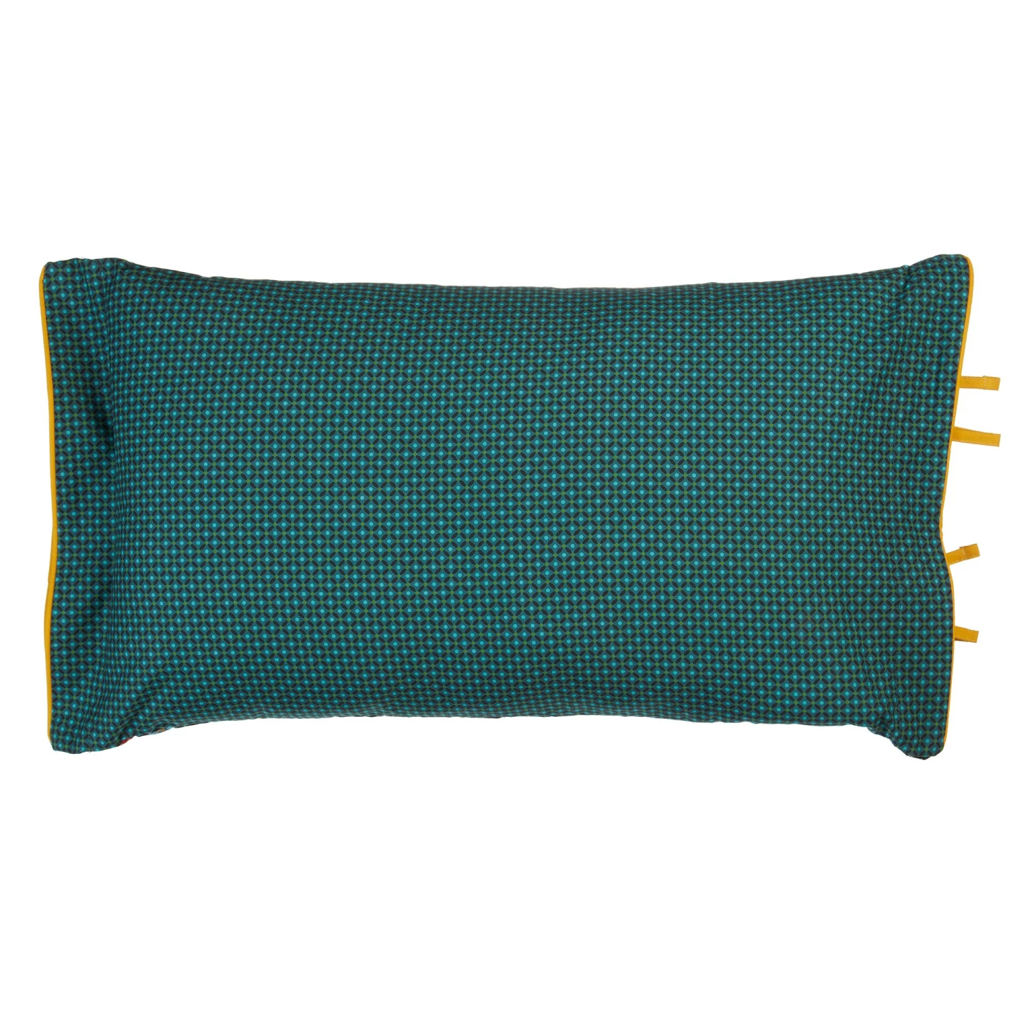 The cushion has an oxford edge with a yellow trim on two sides & a unique tie closure