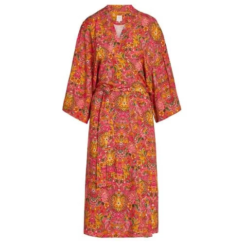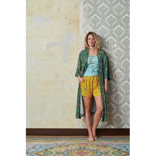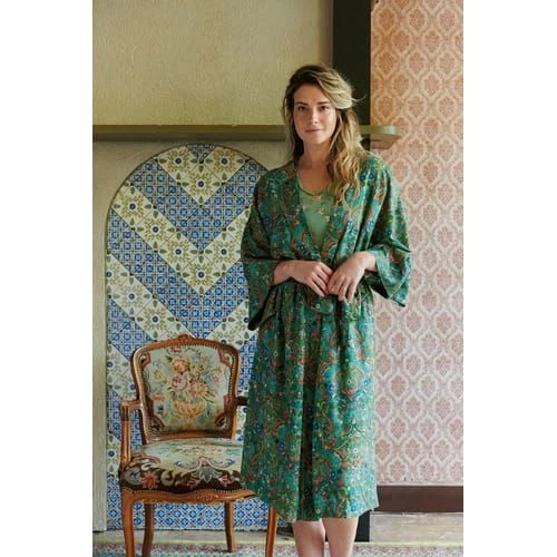 Design consists of multiple sizes flowers, branches & berries on a green background