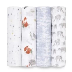 includes 4 pre-washed 47” x 47” (120cm x 120cm) 100% cotton muslin swaddles
