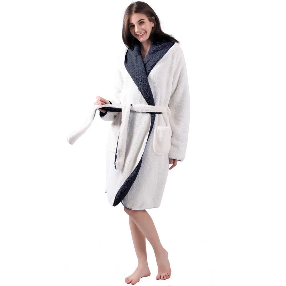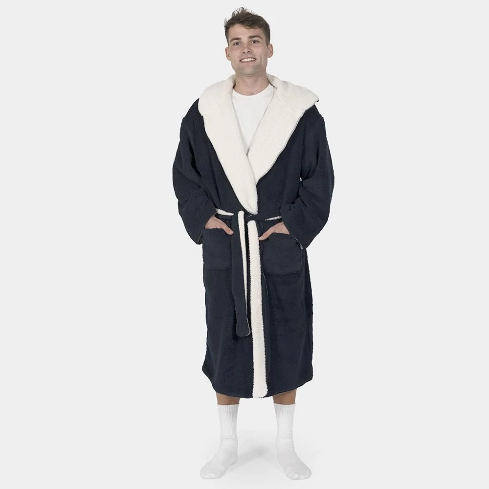 These soft robes are reversible, made from two layers of plush Sherpa fabric, white on one side and a colour on the other. Available in two colours, they also feature an attached hood which adds extra comfort and warmth to these already snuggly robes.