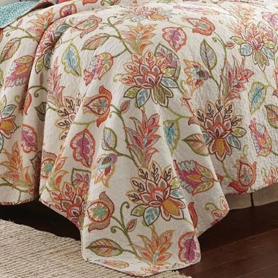 Classic Quilts Sophia King Bed Coverlet Set features a stunning floral pattern. With various different colours being featured throughout, this beautiful design embraces a more traditional style and puts a modern twist on it. It reverses to a aqua coloured geometric pattern. Made with a lovely soft 100% cotton fabric and filled with a 260GSM cotton filling, this coverlet will be an amazing addition to any bedroom.
