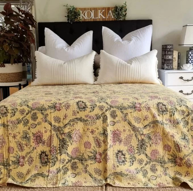 Our kantha bedspreads add personality and vibrancy to any room. The quilt is characterised by its textured finish and intricate kantha work. Delicately hand made with lightweight natural breathable cotton fabric, this floral bedspread will keep you refreshed and cool during warmer temperatures and add colour and layer to your bed during the cooler months. Three layers of superior durable cotton fabric are stitched together by hand to create this amazing work of art.